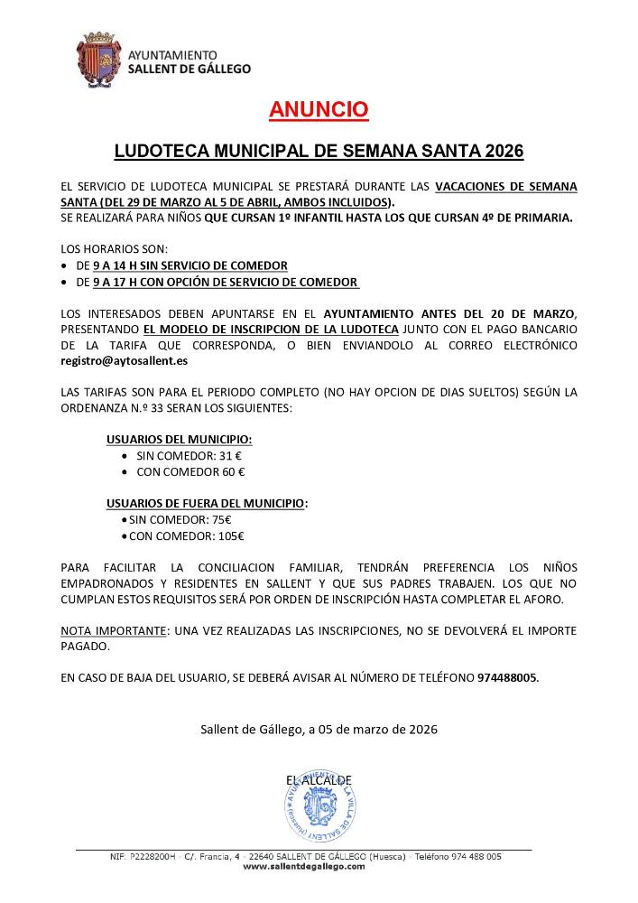 LOS INTERESADOS DEBEN APUNTARSE EN EL AYUNTAMIENTO ANTES DEL 20 DE MARZO, PRESENTANDO EL MODELO DE INSCRIPCIÓN DE LA LUDOTECA JUNTO CON EL PAGO BANCARIO DE LA TARIFA QUE CORRESPONDA, O BIEN ENVIÁNDOLO AL CORREO ELECTRÓNICO registro@aytosallent.es