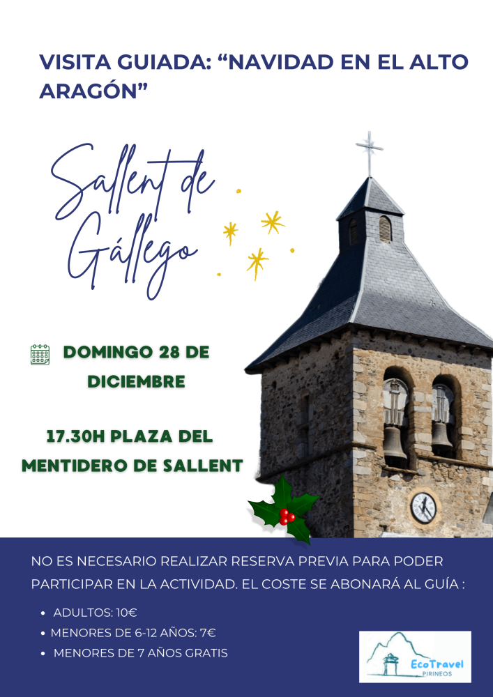 - Inicio 17.30h. El punto de encuentro será la Plaza del Mentidero de Sallent. La temática de la rauta, que recorrerá las calles de la localidad, girará en torno a la Navidad en el Alto Aragón. Se recomienda llevar ropa de abrigo y calzado cómodo.
