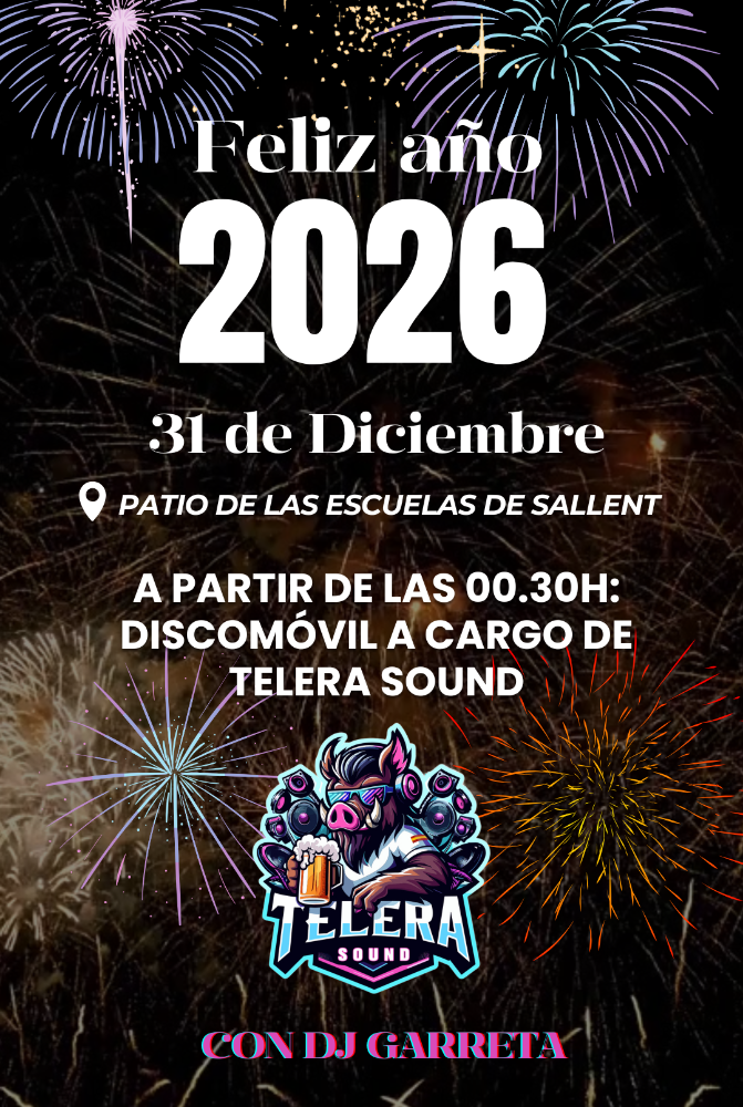 Con motivo de la Nochevieja, el Ayuntamiento de Sallent organiza una fiesta abierta a todo el público en el patio de las antiguas escuelas (junto a la Iglesia), con una discomóvil que empezará a partir de las 00.30h a cargo de TELERA SOUND, con DJ Garreta.