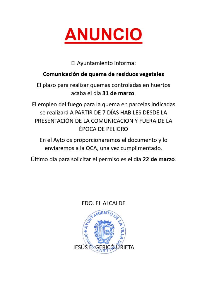 El empleo del fuego para la quema en parcelas indicadas se realizará A PARTIR DE 7 DÍAS HABILES DESDE LA PRESENTACIÓN DE LA COMUNICACIÓN Y FUERA DE LA ÉPOCA DE PELIGRO