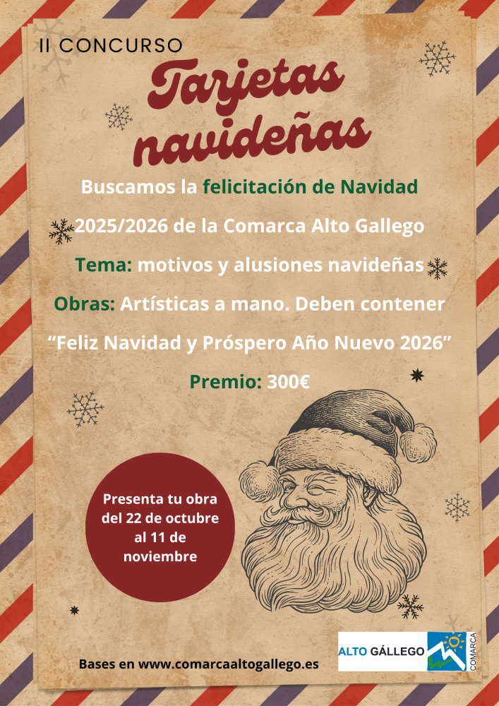 La temática fundamental del cartel son los motivos y tradiciones alusivos a la Navidad. Y deberá realizarse a mano, y consignar el siguiente texto " Feliz Navidad y Próspero Año Nuevo 2026"