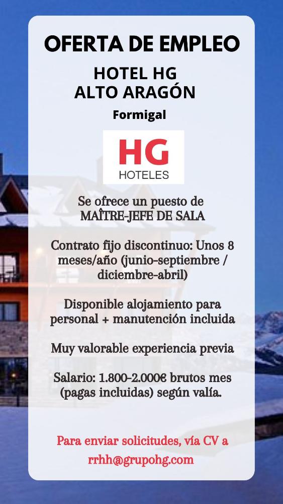 Se ofrece un puesto como MAÎTRE – JEFE/A SALA en el HOTEL HG ALTO ARAGÓN, en Formigal.